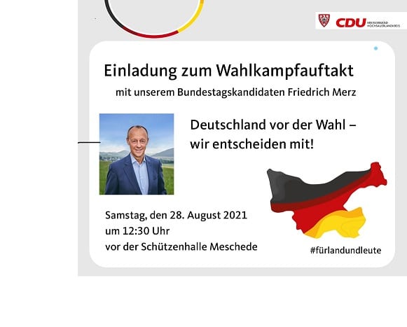 Die CDU im Hochsauerlandkreis lädt herzlich ein zum Wahlkampfabschluss in Neheim. Am kommenden Samstag, 25.09.2021 ab 14 Uhr treffen Sie unseren Kandidaten für den Deutschen
